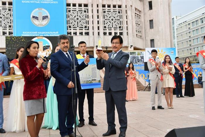 The culmination of the holiday was the solemn presentation of the ID-card by Rector Galym Mutanov for the first-year student of the Faculty of History, Archeology and Ethnology Yernur Zhanbyrbaev and student of the Faculty of Information Technology Magzhan Dat. In addition, the best students of the Faculties of Journalism and Oriental Studies - Akbota Akhmetova and Nazerke Tilektes were invited to the stage to present the key of knowledge.