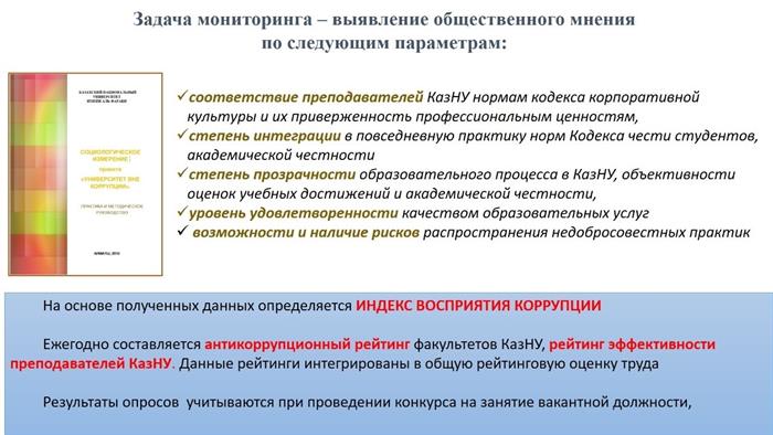 Traditionally, based on the research results, an anticorruption rating of subdivisions have been presented. This rating is an important component of the annual comprehensive evaluation of the activities of teachers, Departments, and Faculties, implemented as part of results-based management. It is the basis for annual competition to fill the positions of Deans of Faculties, Heads of Departments and all faculty members. Currently, Al-Farabi KazNU is one of the first higher education institutions in the country to begin the procedure of certification of the University’s anti-corruption management system for compliance with ISO 37001:2016.