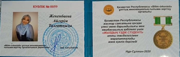 The main goal of the competition is to increase the innovative potential of the best students, exchange experience, and develop research skills of young scientists. 400 students of Kazakh universities took part in the competition. 4th year student of the Physics and Technology Faculty of the Al-Farabi Kazakh National University, specialty “Standardization and Certification (by industry)”, Aigerim Zhekenbayeva was awarded the title of "Best Student of the Year 2020".