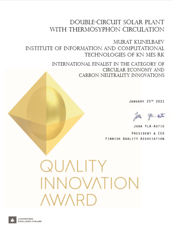 Murat Kunelbayev became an international finalist in the Cyclic Economy and Innovations in Carbon Neutrality nomination of the SNS Institute of Information and Computing Technologies of the Ministry of Education and Science of the Republic of Kazakhstan, presenting the project "Double-circuit solar installation with thermosyphon circulation" The event was attended by innovators from 15 countries of the world. This year the competition was held online.