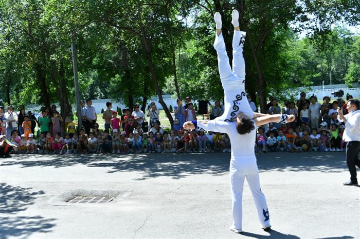 In the solemn part of the holiday, students of the military department performed in front of the children with a concert program that includes children's songs, humorous numbers and joint performance of famous songs. The program of the holiday was decorated with performances by animators about the world of fairy tales. During the holiday, children took part in various competitions: "Drawing on the pavement", "Sharp shooter!", "Guess the fairy tale!". High school students took part in the historical quiz "My Motherland Kazakhstan!"