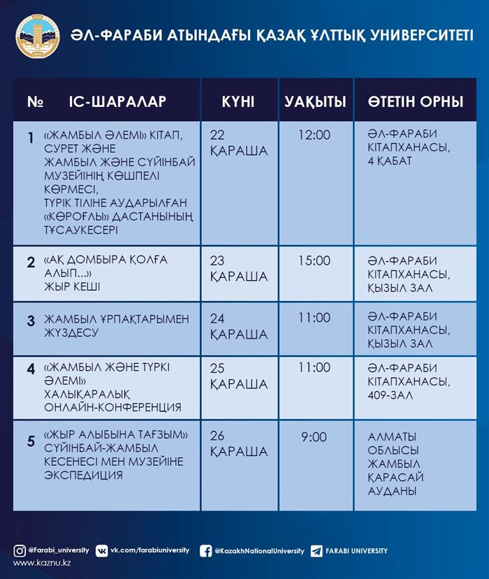 A week dedicated to the 30th anniversary of Kazakhstan's independence and the 175th anniversary of the birth of the poet Zhambyl Zhabayev will be held at the Al-Farabi Kazakh National University on November 22-28.