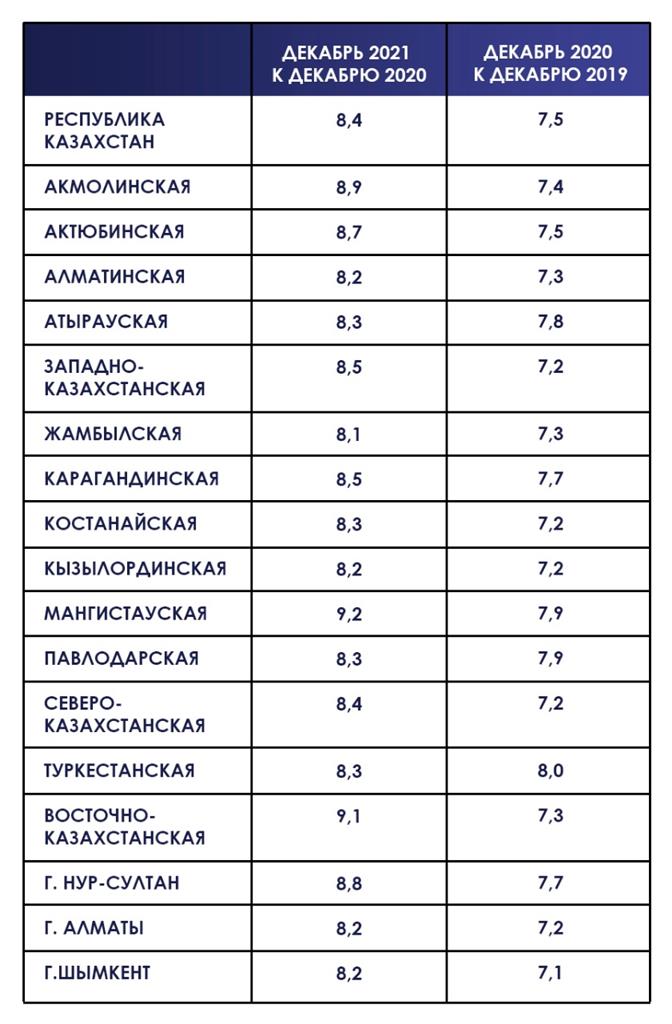 Despite the measures taken by the government, inflation worsened the well-being of the population. By December 2021, the inflation rate in Kazakhstan amounted to 8.4 percent. Compared to 2020, the inflation rate increased by 0.9 percentage points. The highest inflation rate in 2021 was in the Mangystau region of 9.2 percent, it increased by 1.3 percentage points compared to the previous year.