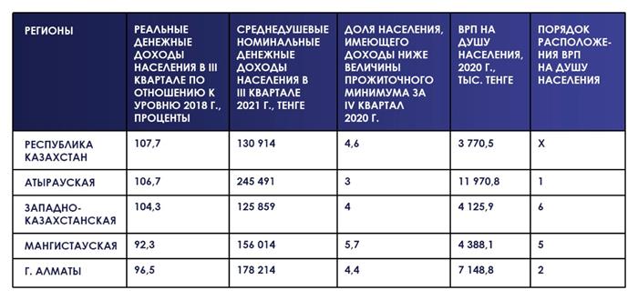 It follows from Table 1 that, in general, in Kazakhstan, real money incomes of the population in the third quarter of 2021 compared to 2018 increased by 7.7 percent, in Atyrau region - by 6.7 percent and in the West Kazakhstan region - by 4.3 percent. But in the Mangistau region over the same period there was a decrease in real cash income by 7.7 percent, and in Almaty - by 3.5 percent. This means that on average in the Mangistau region and in Almaty, people could afford to purchase 4-8 percent less goods than 3 years ago. Therefore, it is no coincidence that the protest moods in society were formed to a greater extent in these two regions.