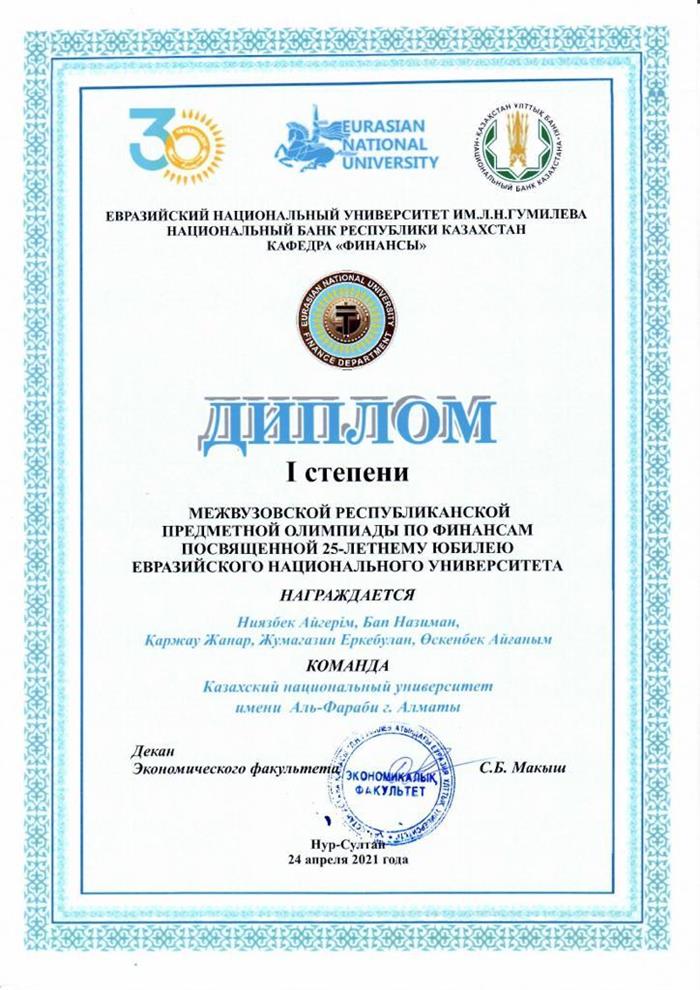 On April 24, 2021, with the support of the National Bank of the Republic of Kazakhstan in online format on the Microsoft Teams platform was held a subject interuniversity Olympiad in finance, dedicated to the 25th anniversary of the L.N. Gumilyov. Olympiad was organized by the Faculty of Finance of the L.N. Gumilyov. The first place was taken by a team of students of the specialty "Finance" of the Higher School of Economics and Business of the al-Farabi Kazakh National University. Scientific supervisor Supugalieva Gulnazim Islamovna, senior lecturer of the Department "Finance and Accounting". |