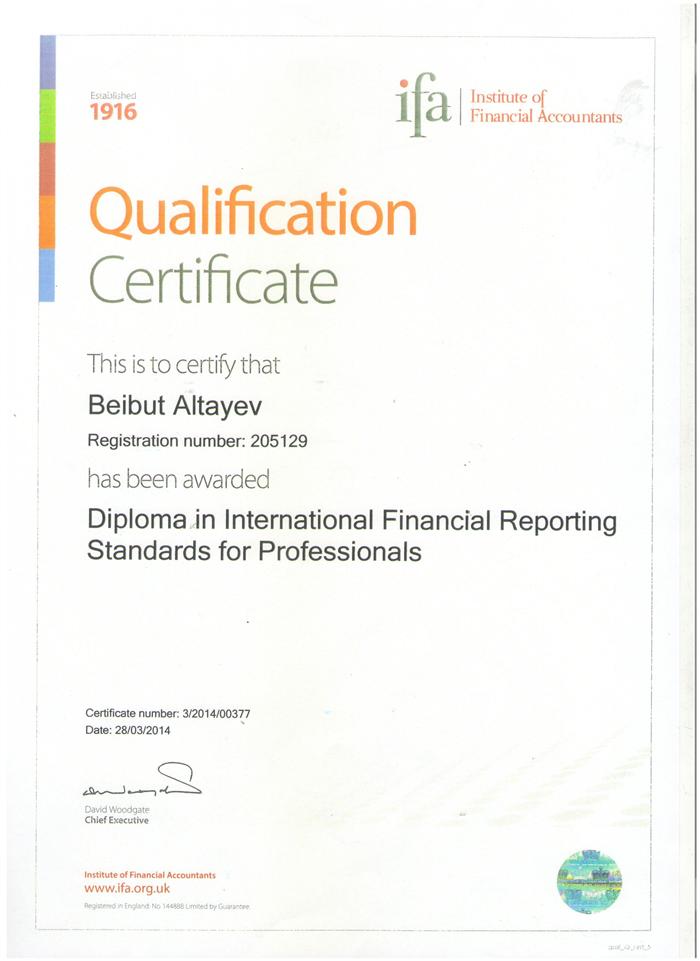 Qualification Certificate This is to Beibut Altaev has been awared Diploma in International Financial Reporting Standarts for Professionals 28 March 2014 year |