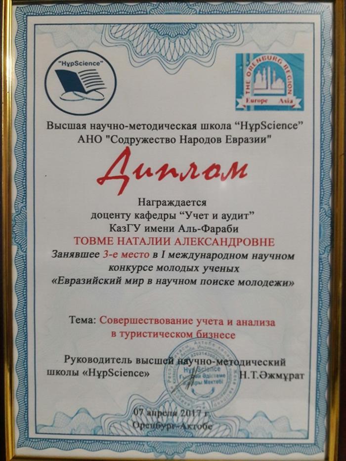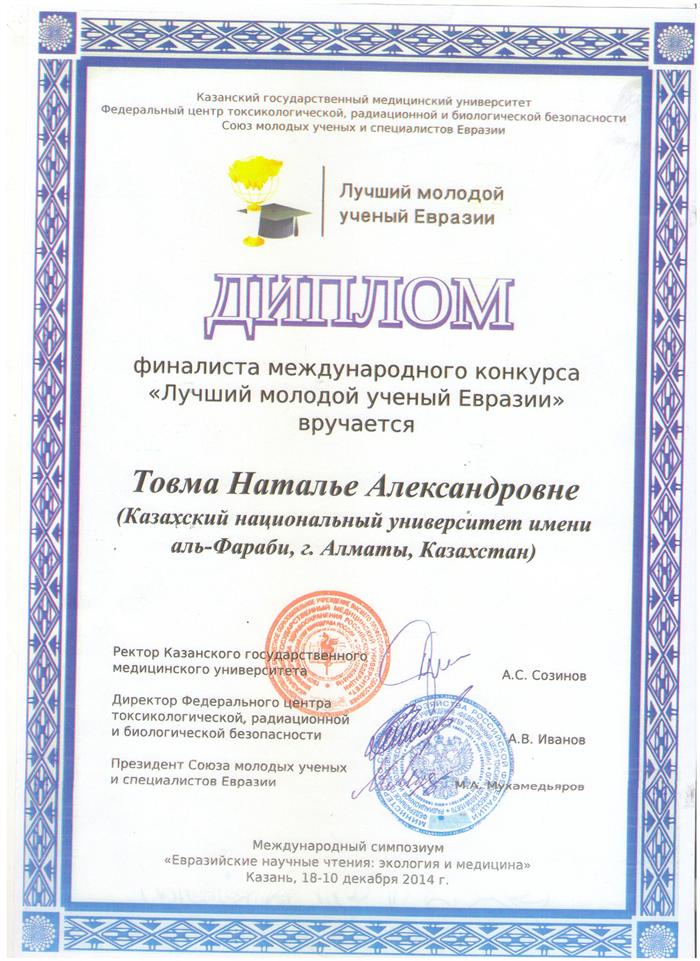 Tovma Natalia was awarded a Diploma of the finalist of the international competition "Best young scientist of Eurasia" 18 December 2014 year |