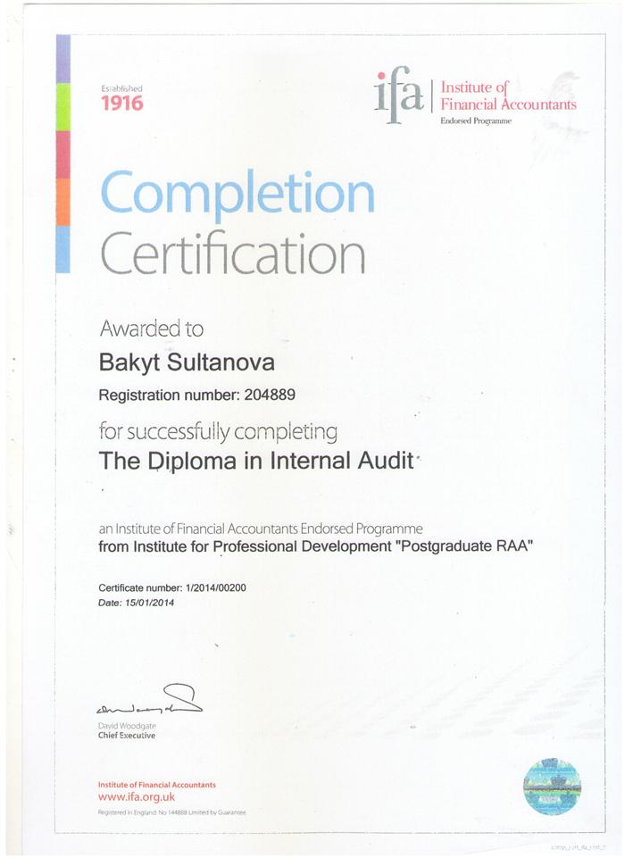Qualification Certificate This is to Bakyt Sultanova has been awared Diploma in International Financial Reporting Standarts for Professionals 11 February 2014 year |