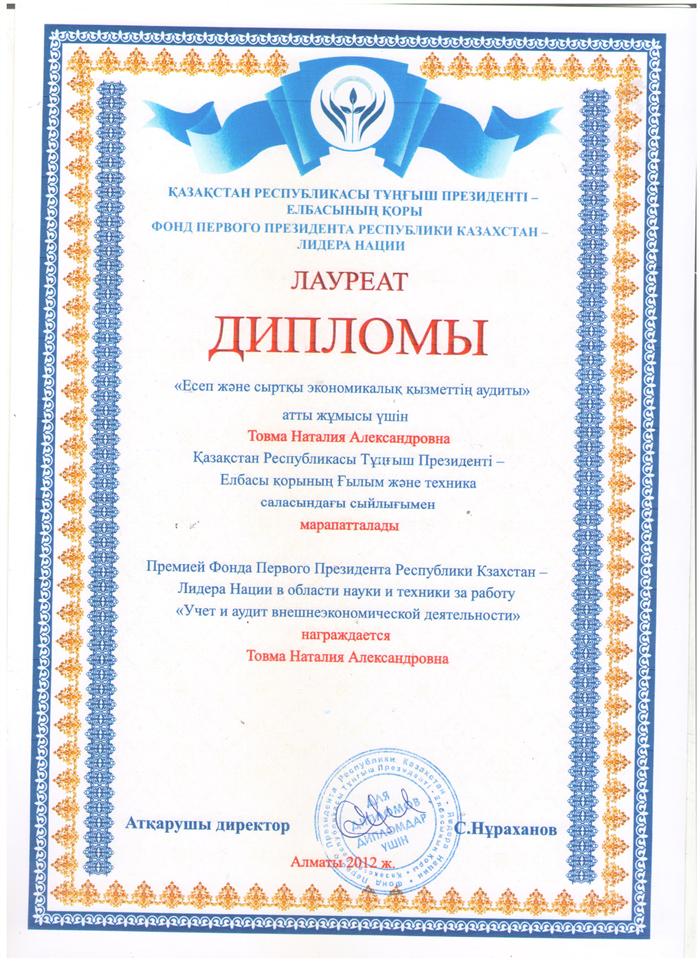 Tovma Natalia awarded the Foundation of the First President of Kazakhstan Leader of the Nation in the field of science and technology for work, "Accounting and audit of foreign trade activities" 08 December 2012 year |