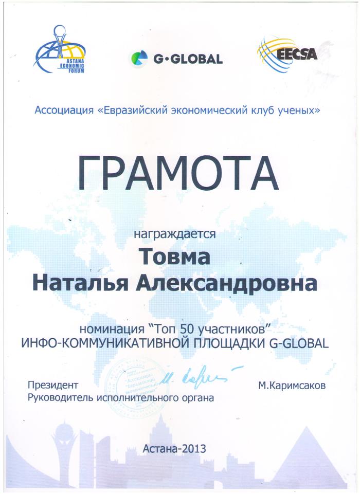 Tovma Natalia was awarded a diploma for namination "Top 50 participants of the Info communication platform G-GLOBAL" 15 October 2013 year |