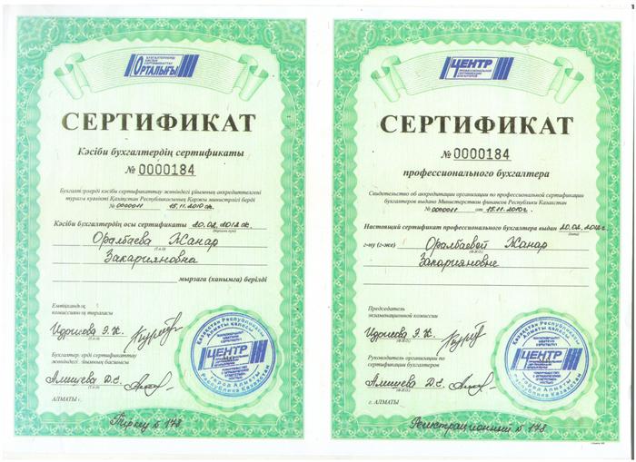 Oralbaeva Zhanar Zakariyanovna awarded certificate of professional accountanter 20 February 2012 year |