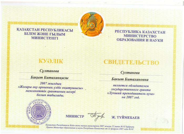 Bakhyt Sultanov Bidahanovna "Best University Teacher" in 2007 22 February 2007 year |