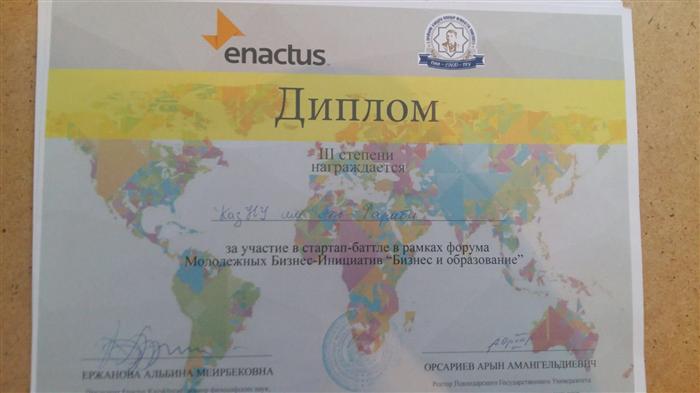 Student of the specialty "Accounting and Auditing" - Zhanbyr Sultan was awarded the diploma of 3 degrees for participation in start-Batlle at the Forum Youth Business Initiative "Business and Education" 20 October 2015 year |