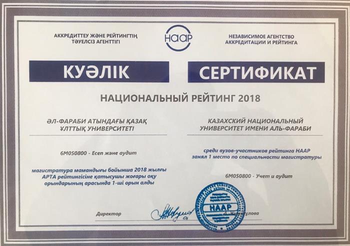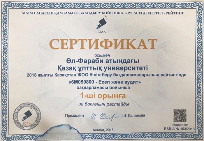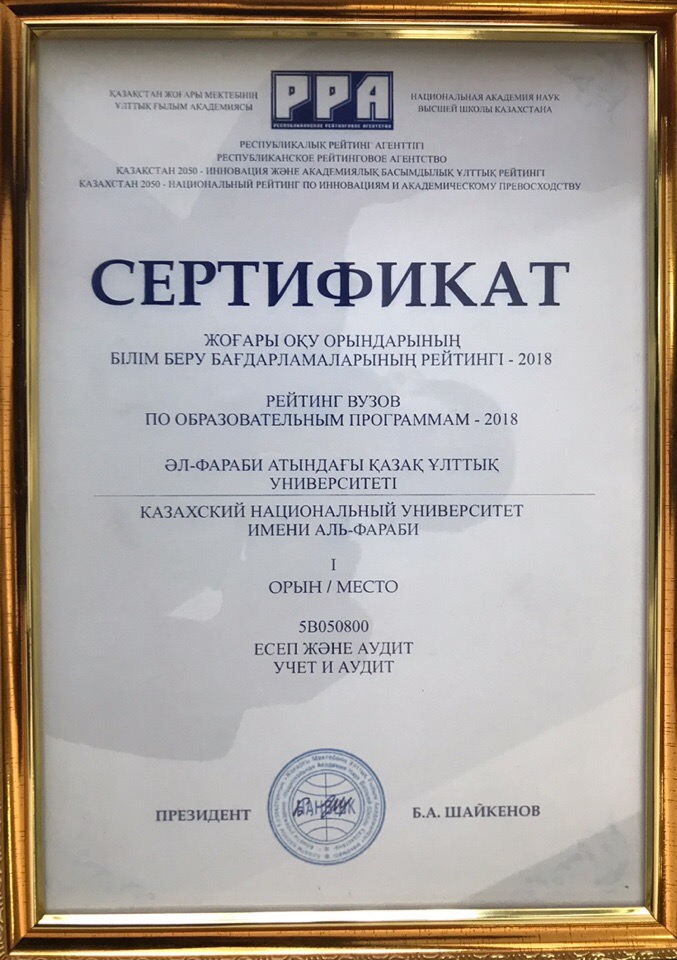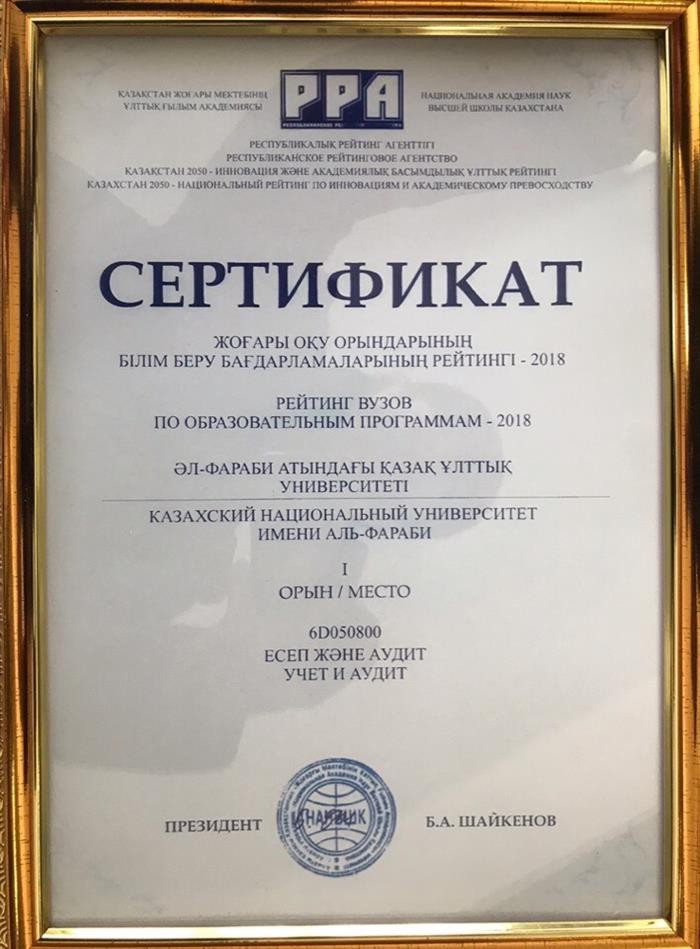 Al-Farabi Kazakh National University confirms that in 2018 in the ranking of educational programs of universities of Kazakhstan under the program "6M050800 - accounting and audit" took 1st place. 2018 year |