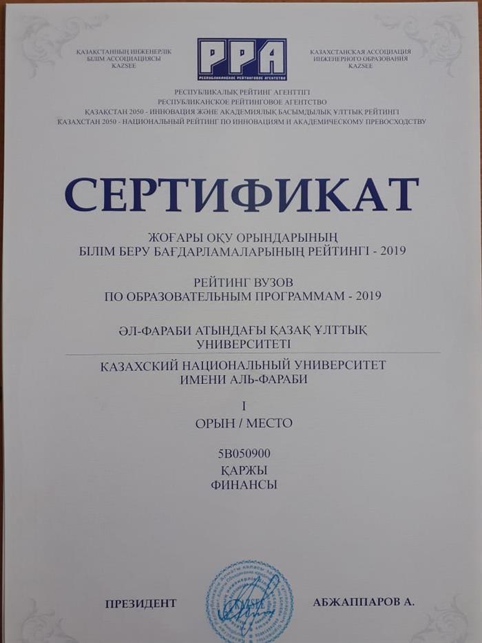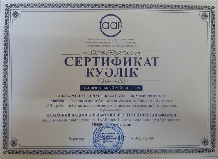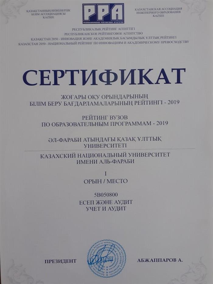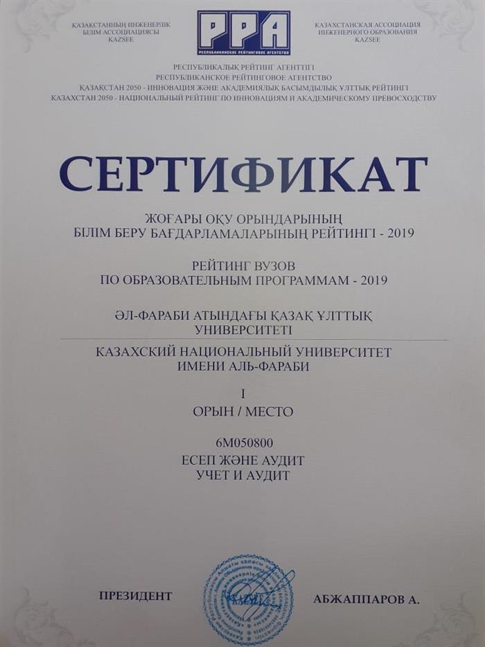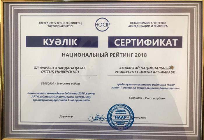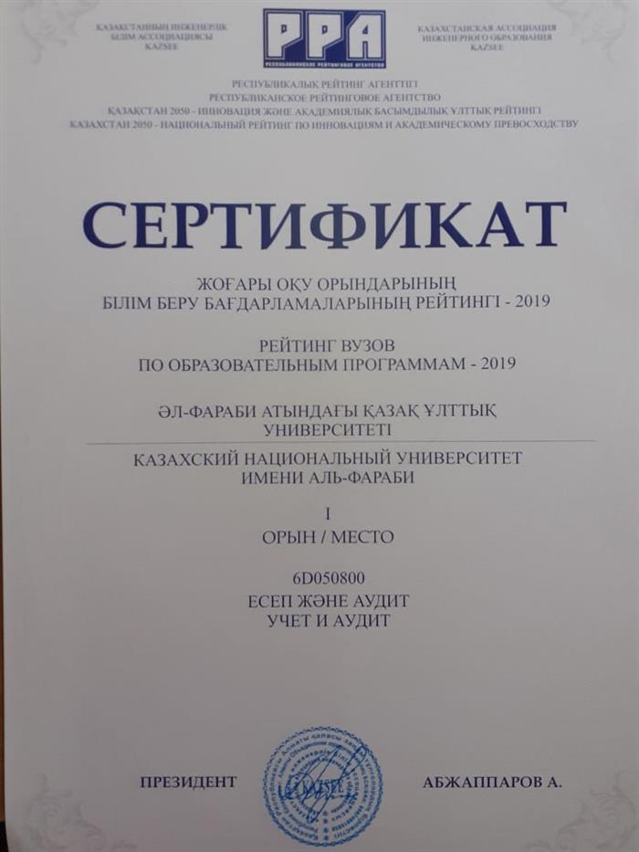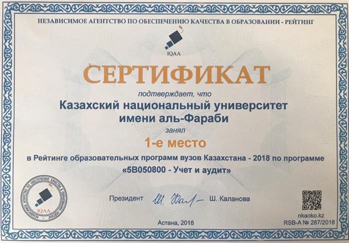 Al-Farabi Kazakh National University took 1st place among the universities participating in the IAAR ranking in the specialty of bachelor " 5B050800-Accounting and Auditing". 2018 year |