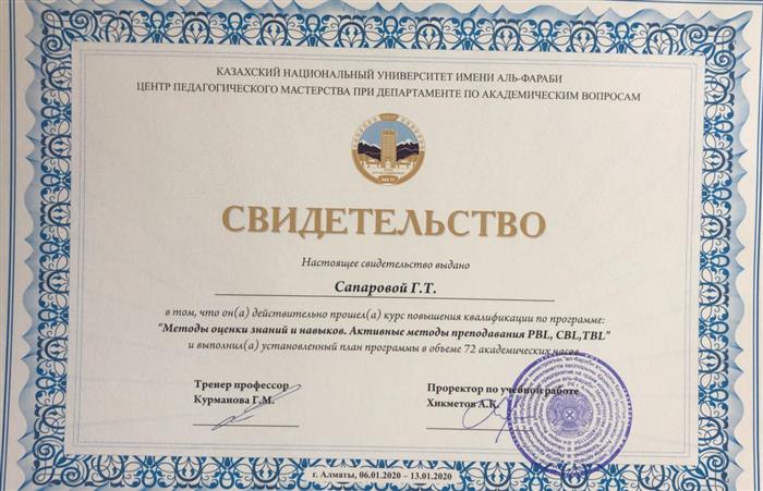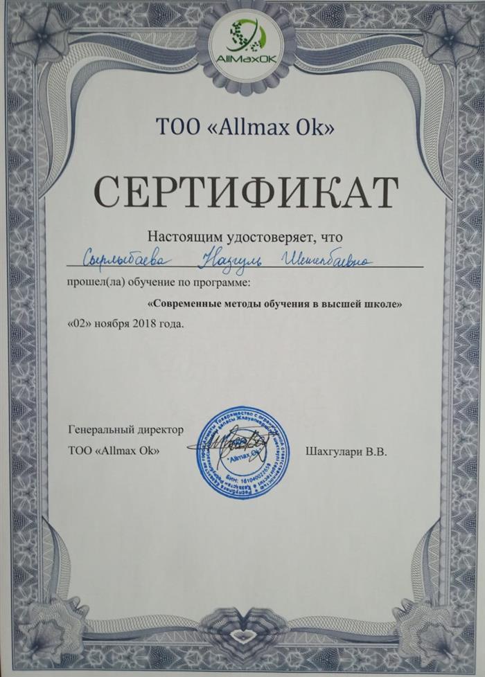 Kassenova Gulmira Esenovna, candidate of economic sciences, attended 72-hour advanced training courses in the disciplines "Finance" and "Financial analysis and evaluation of projects" 2018 year