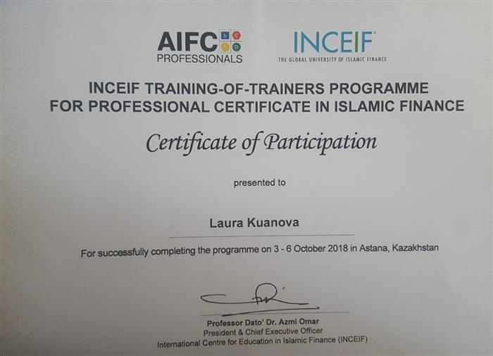 Lecturer of the Department of Finance Laura Kuanova took courses "Teacher Training" INCEIF, Malaysia. 2018 year