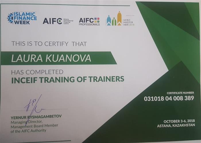 Lecturer at the Department of Finance Laura Kuanova took advanced training courses at the AIFC "Traning of trainers" 2018 year