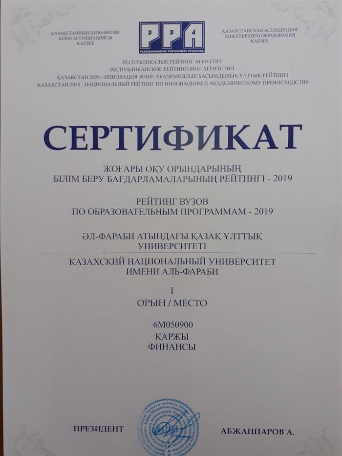 Al-Farabi Kazakh National University took 1st place among the universities participating in the PPA ranking in the specialty of doctorate " 6D050800-Accounting and Auditing" 2018 year |