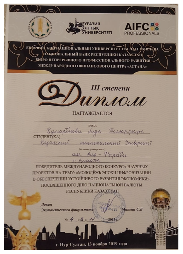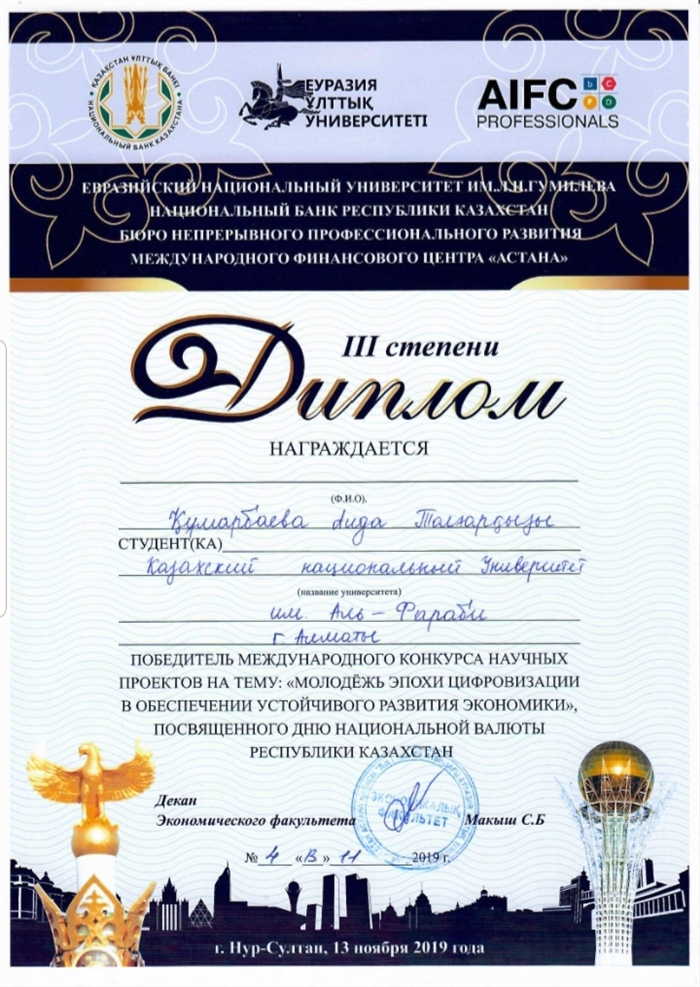The 3rd year student of the specialty "Finance" of the Higher School of Economics and Business Kumarbayev A. D. took the 3rd place at the international competition of scientific projects "YOUTH OF the era of DIGITALIZATION IN ensuring SUSTAINABLE ECONOMIC DEVELOPMENT", dedicated to the day of the financier. 13.11.2019 year
