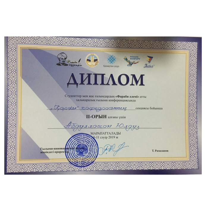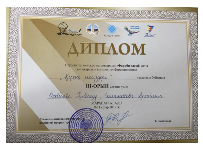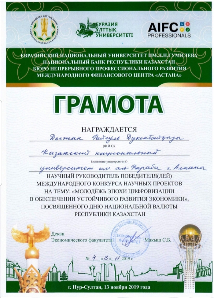 Awarded Doszhan R.D. supervisor of winner of the international competition of scientific projects on the theme ""YOUTH of the ERA of DIGITALIZATION IN ENSURING SUSTAINABLE economic DEVELOPMENT", devoted to day of national currency of the Republic of Kazakhstan 13.11.2019 year |