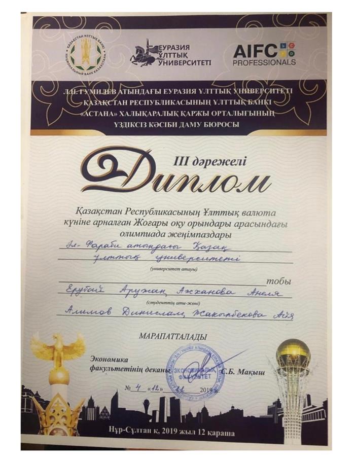 Awarded the group of the University of KazNU in the inter-university Olympiad dedicated to the day of the national currency of the Republic of Kazakhstan 04.12.2019 year |