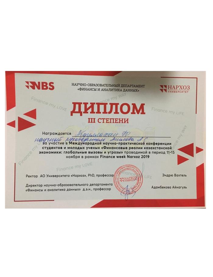 Awarded Abdullahan Y., academic Supervisor Asilova A.S., in the International Scientific and Practical Conference "Financial Realities of the Kazakhstan Economy: Global Challenges and Threats" 15.11.2019 year |