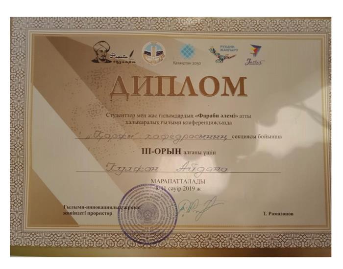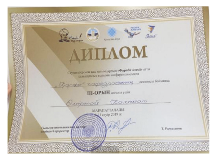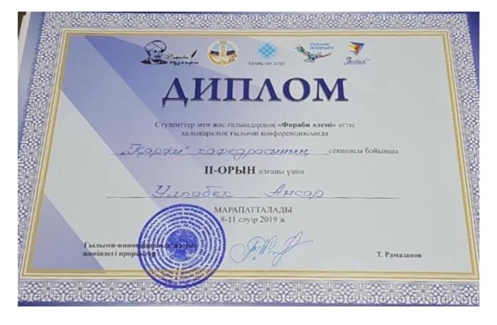 Students Muhadil Ү., Borіbay K. took III place in the International scientific-practical conference "Farabi Alemi" |