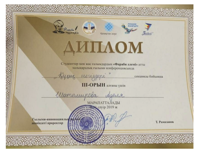 Student Shatemirova A. took III place in the International scientific-practical conference "Farabi Alemi" |