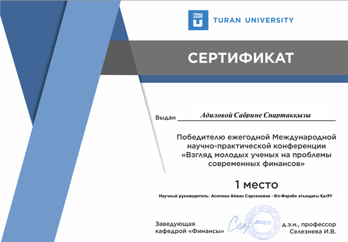 The student of KazNU University Adilova S. S., scientific adviser Asilova A. S., is awarded at the International Scientific and Practical Conference "The View of Young Scientists on the Problems of Modern Finance"