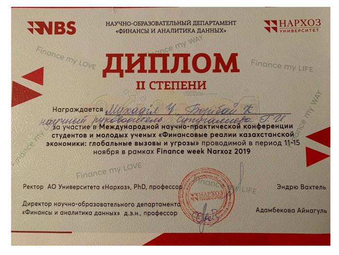 Мұхаділ Ү., Бөрібай К., ғылыми жетекшісі Супугалиева Г.И. «Қазақстан экономикасының қаржылық жағдайы: жаһандық сын-қатерлер мен қауіп-қатерлер» халықаралық ғылыми-практикалық конференциясында марапатталды 15.11.2019 жыл |