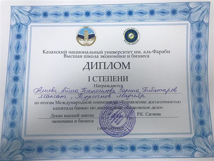 Awarded with a diploma of I degree Aliyev A., Tokmeilova Z., Bibatyrov M., Tursynov M. according to the results of the International Olympiad "Management of bank capital adequacy" in the discipline "Banking". |