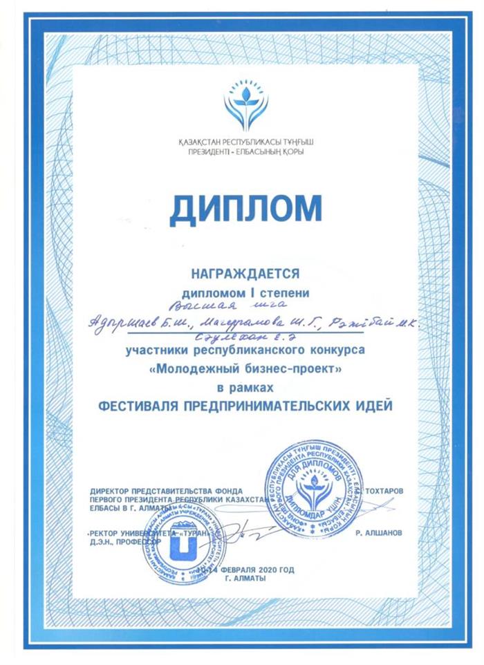Students of the Higher School of Economics and Businesses are awarded with a diploma of the 1st degree according to the results of the republican contest "Youth Business Project" as part of the festival of entrepreneurial ideas. Adyrshayev Bekarys Magerramova Shelale Rajibay Moldir Saulekhan Erkezhan Supervisor is Nizamdinova Arzigul Kamirdinovna 10-14.02.2020 |