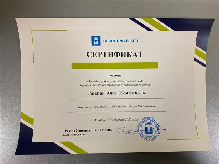 Certificate for participation in the International Student Olympiad "Problems of Improving Accounting" Ramazan A.ZH. Scientific adviser - Baimukhanova S.B.