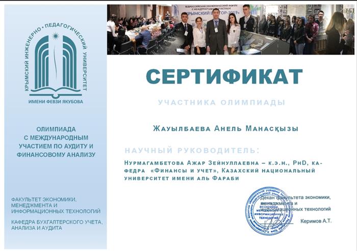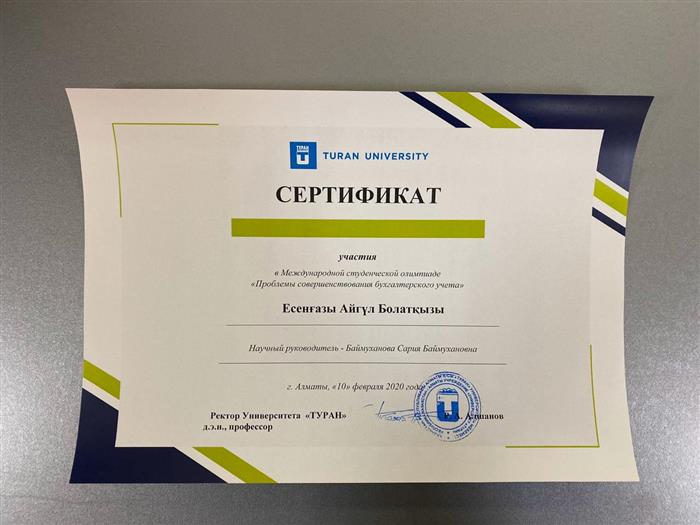 Certificate for participation in the International Student Olympiad "Problems of Improving Accounting" Serikkyzy A. Scientific adviser - Baimukhanova S.B.