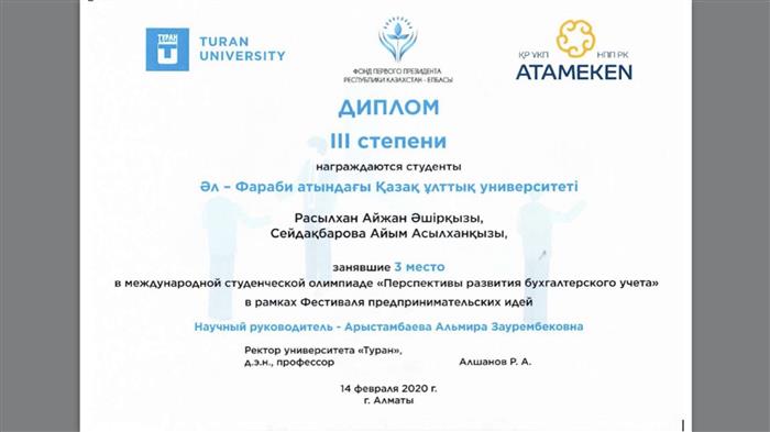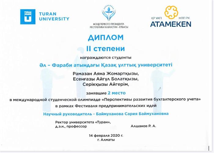 Rasylkhan A.A., Seydakhbarova A.A. are awarded took 3rd place in the international student olympiad "Prospects for the development of accounting" in the framework of the Festival of Entrepreneurial Ideas. |