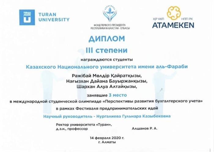 Students of the Kazakh National University named after Al-Farabi Razhibay M.K., Nagyzhan D.B., Sharhan A.A. are awarded with the III degree diploma in the international student olympiad "Prospects for the development of accounting".
