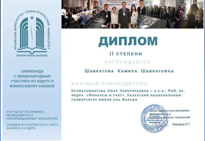 With a diploma of II degree Shavkatova K.Sh. will be rewarded. Research supervisor - Nurmagambetova AZ - PhD, Department of Finance and Accounting, Al-Farabi Kazakh National University. |