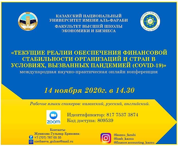 The Department of Finance and Accounting will hold an international scientific and practical online conference on November 14, 2020 on the topic "Current realities of ensuring the financial stability of organizations and countries in the conditions caused by the pandemic (COVID-19)."The speakers will present the current business cases for the discussion of the impact of the pandemic (COVID-19) on all aspects of the functioning of the economy and its stability in the context of the need to ensure anti-crisis and sanitary-epidemiological measures.Beginning of the conference: November 14, 2020 at 14.30.Time limit for each performance: 5-10 minutes. |