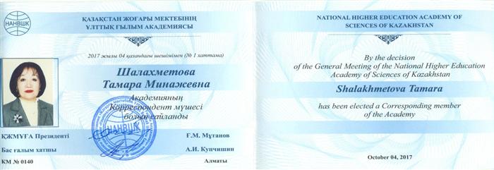 4th October, 2017 by the decision of the General Meeting of the National Higher Education Academy of Sciences of Kazakhstan Doctor of Biological sciences, Professor Tamara Shalakhmetova was elected a Corresponding member of the Academy (КМ №0140). |