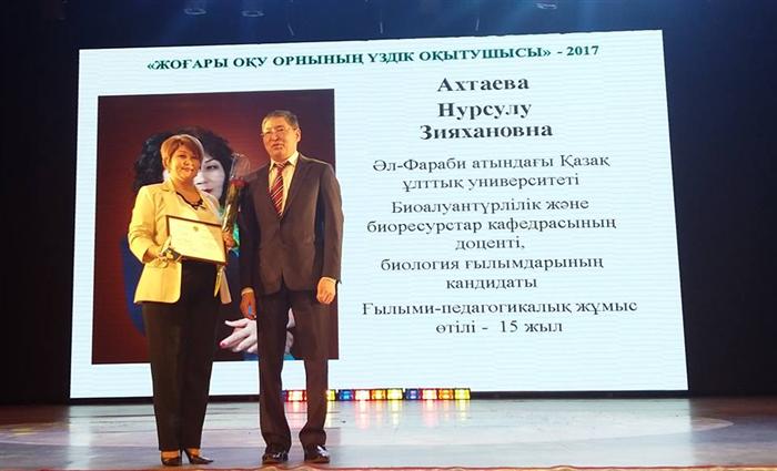 Owner of a grant Ministry education and sciences of RK "The Best Teacher of Higher Education Institution" of 2017 Аhtaeva Nursulu candidate of biological sciences, senior lecturer