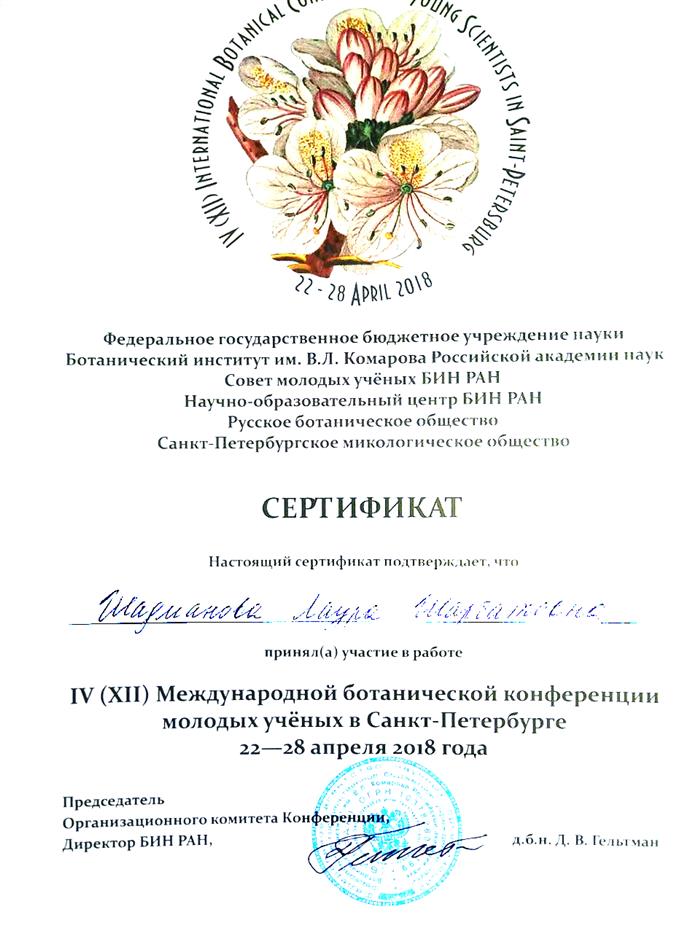 Doctoral student of the 1st course of the specialty "Geobotany" of the Department of Biodiversity and Bioresources Shadmanova Laura attended the IV (XII) International Botanical Conference of Young Scientists in St. Petersburg on April 22-28, 2018 |