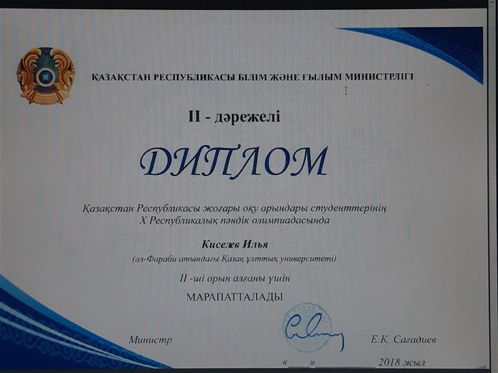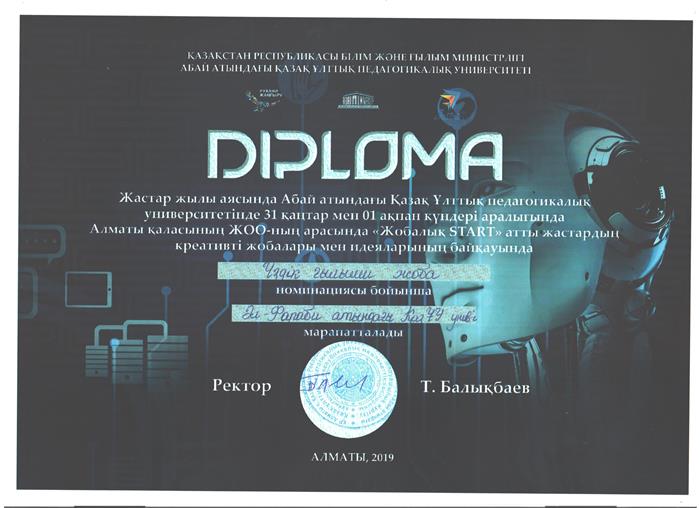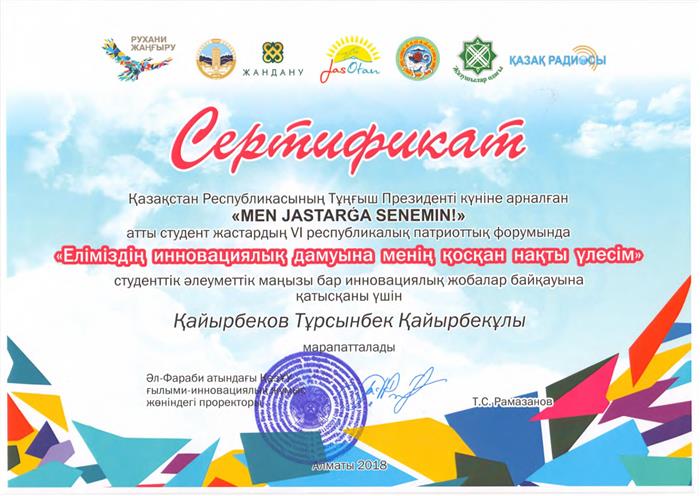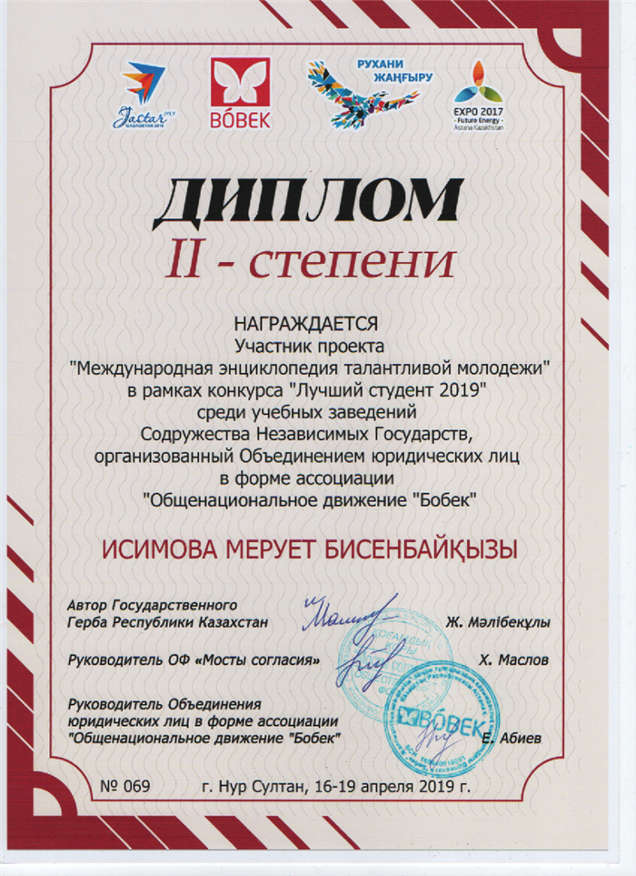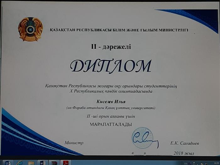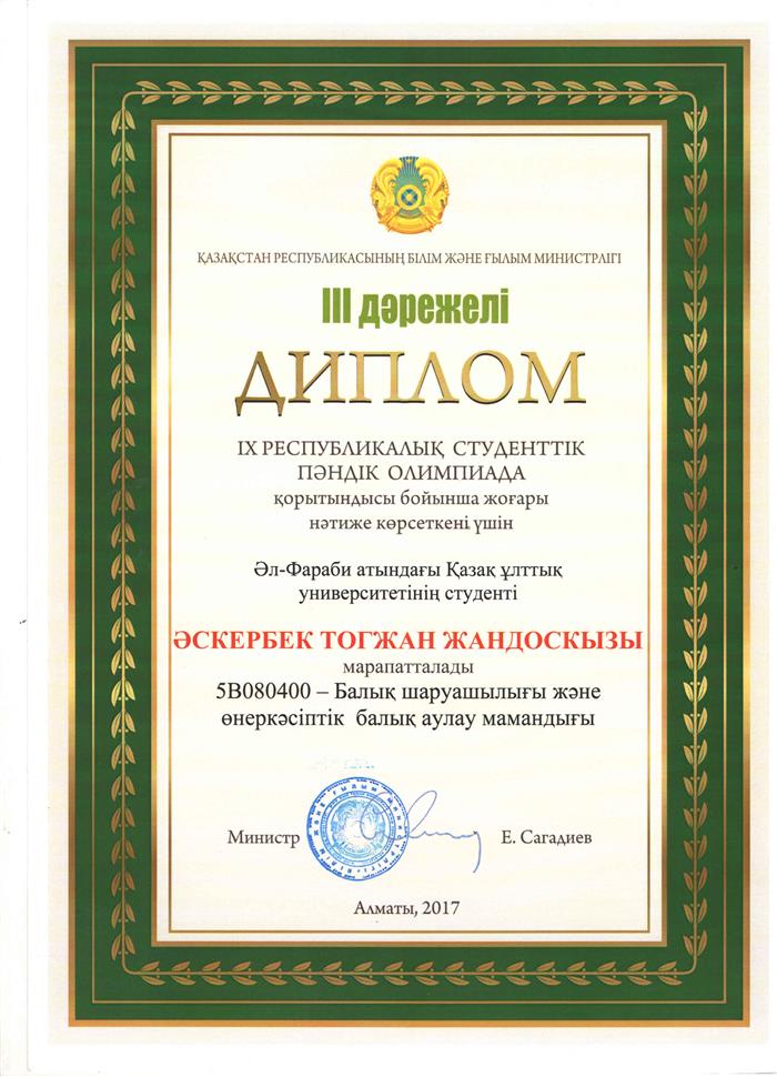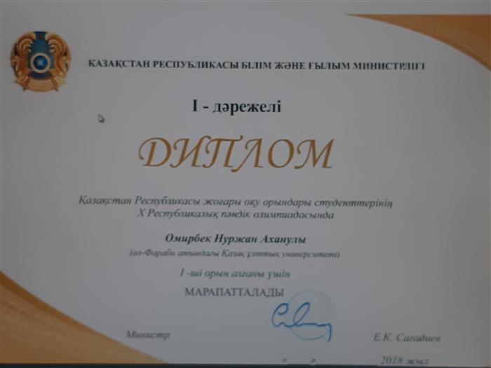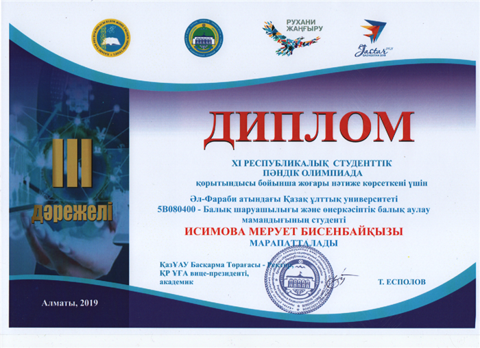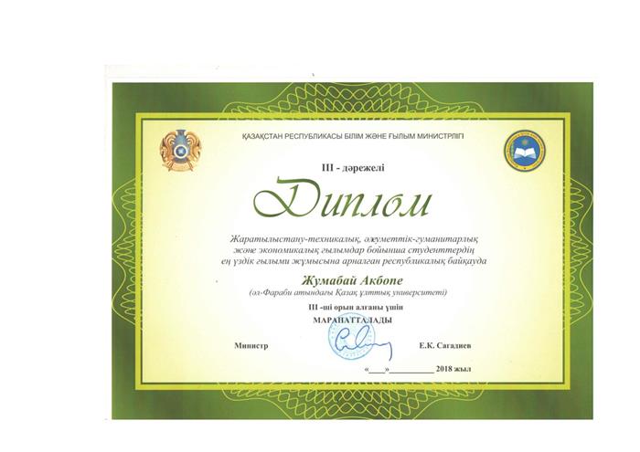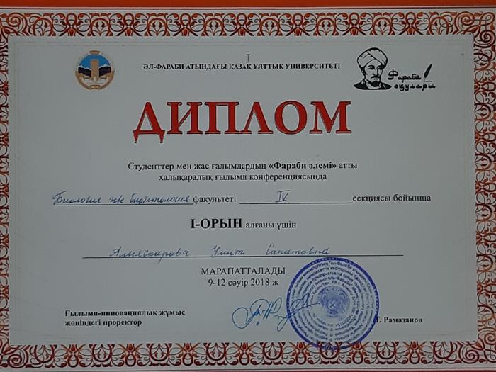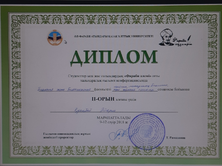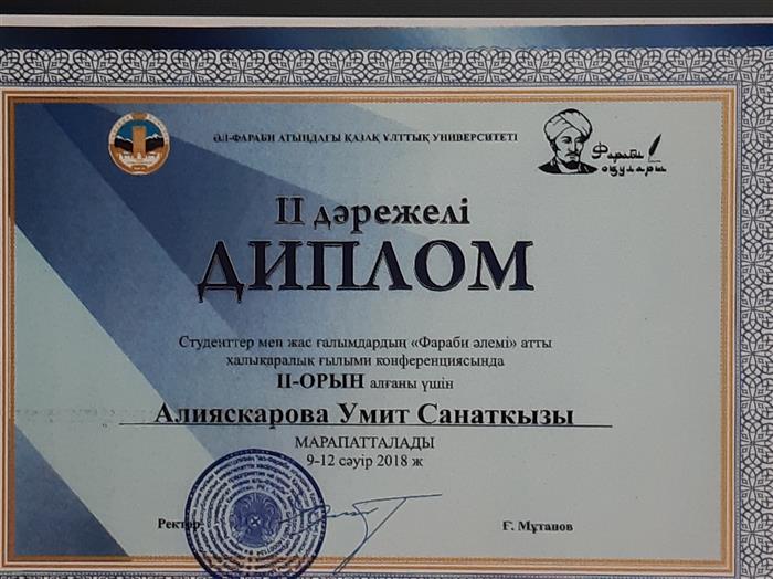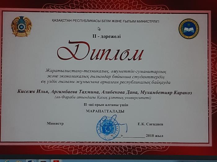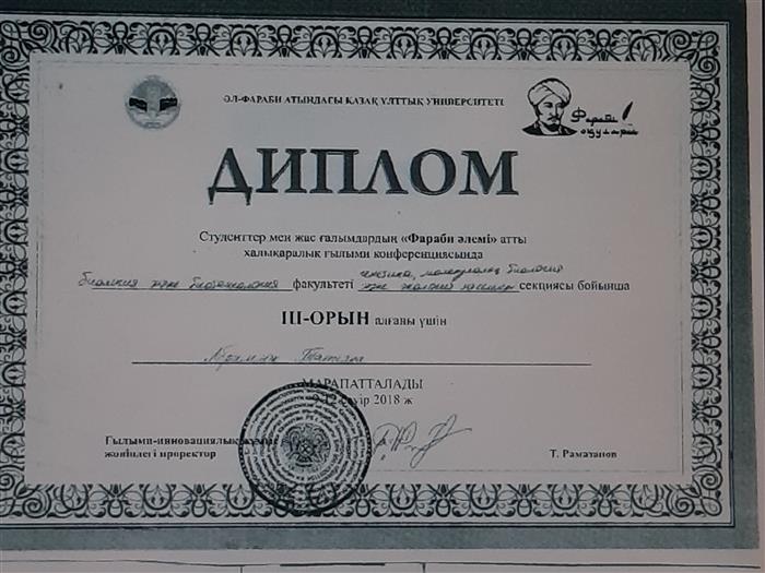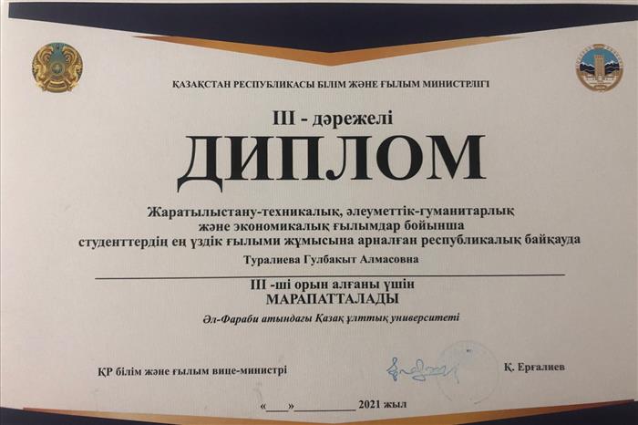 Жаратылыстану-техникалық, әлеуметтік-гуманитарлық және экономикалық ғылымдар бойынша студенттердің ең үздік ғылыми жұмысына арналған республикалық байқауда 3-ші орын алғаны үшін Туралиева Гулбақыт марапатталады. ғылыми жетекшілері: Мамурова А.Т., Ахтаева Н.З.,