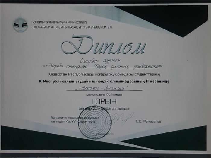 Decision of the Presidium of the Russian Academy of Natural Sciences, Department of biodiversity and Bioresources Al-Farabi University Dr., Professor Saparov Kuandik Abenovich awarded Medal of Vavilov for outstanding work in the field of biology.