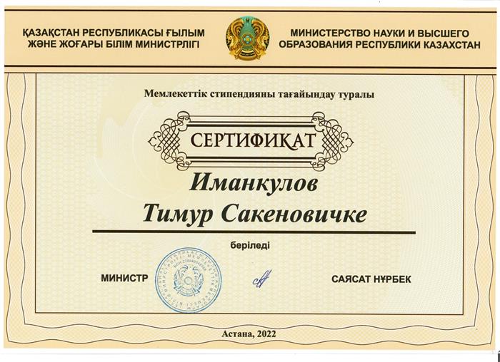 Imankulov Timur Sakenovich - doctor PhD. Winner in 2022nominal awards in the field of sciences andstate scientific scholarships. |