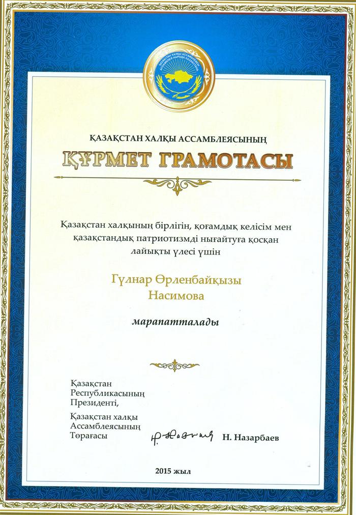 Head of the Chair of Political Science and Political Technologies, Doctor of Political Sciences, Professor Nasimova Gulnar Orlenbaevna was awarded the diploma "For the worthy contribution to strengthening the unity of the people of Kazakhstan, social harmony and Kazakhstani patriotism" |