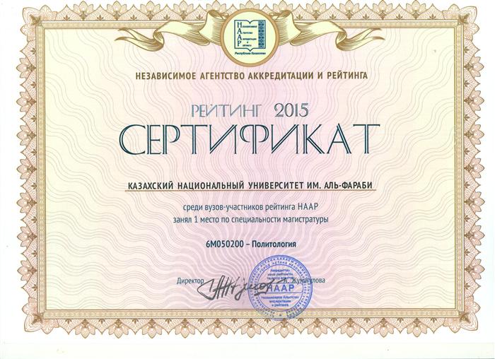 Al-Farabi Kazakh National University among the universities participating rated Independent Agency for Accreditation and Rating (IAAR) 1st place for bachelor specialties 5М050200-Political Science |