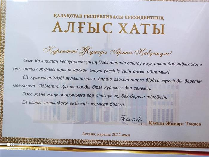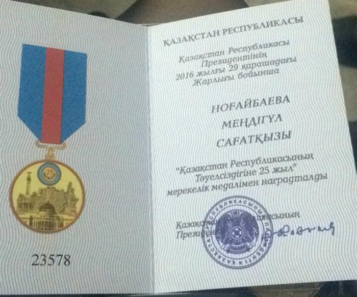 It is awarded by a festive medal of the President of Kazakhstan in honor of "the 25th anniversary of independence of the Republic of Kazakhstan": |