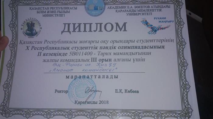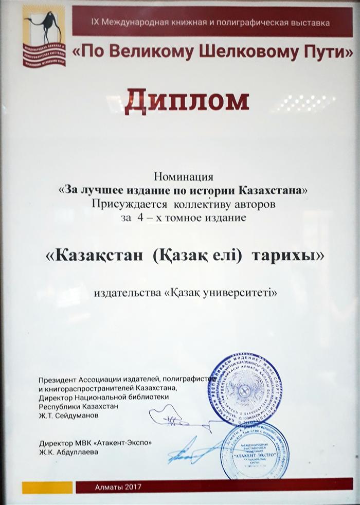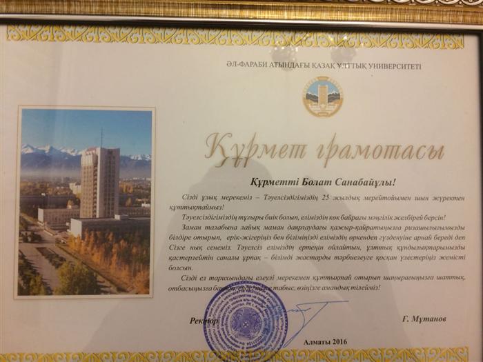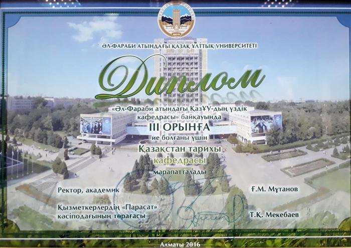 Are awarded by the diploma "Kurmet" of the rector of KazNU after named Al-Farabi prioruchenny to the 25th anniversary of Independence: Sailan Bolat Sanabayly, Akhmzhanova Azhar Toksanovna, Teleuova Elmira Teshebaevna, Tasilova Naziya Aitbaevna |