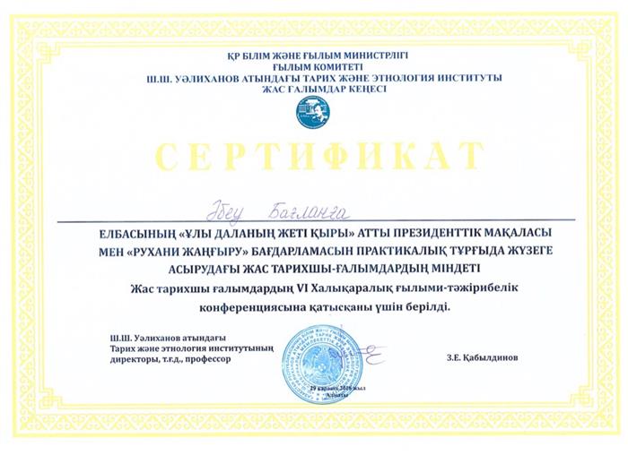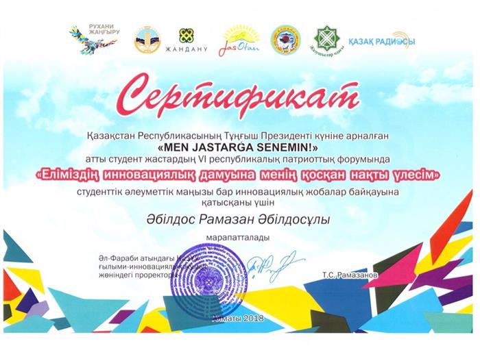 Certificate of 2nd year student Abildos Ramazan for participation in the VI Republican Patriotic Forum |